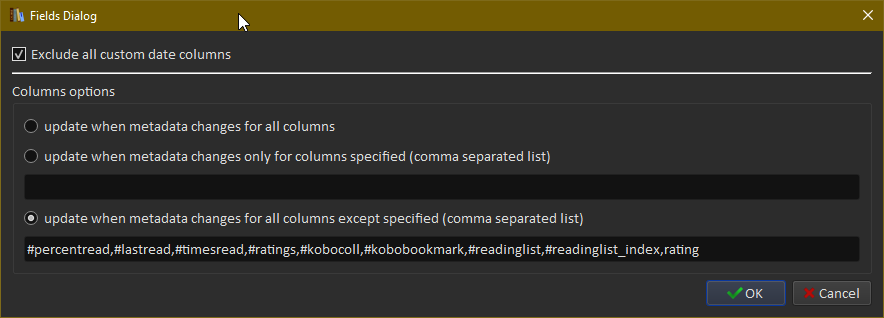 Under 'book metadata changed' you can blacklist or whitelist specific columns. (Thankfully, you can ignore composite ones!) Last edited by ownedbycats; 08-16-2023 at 04:28 PM. |