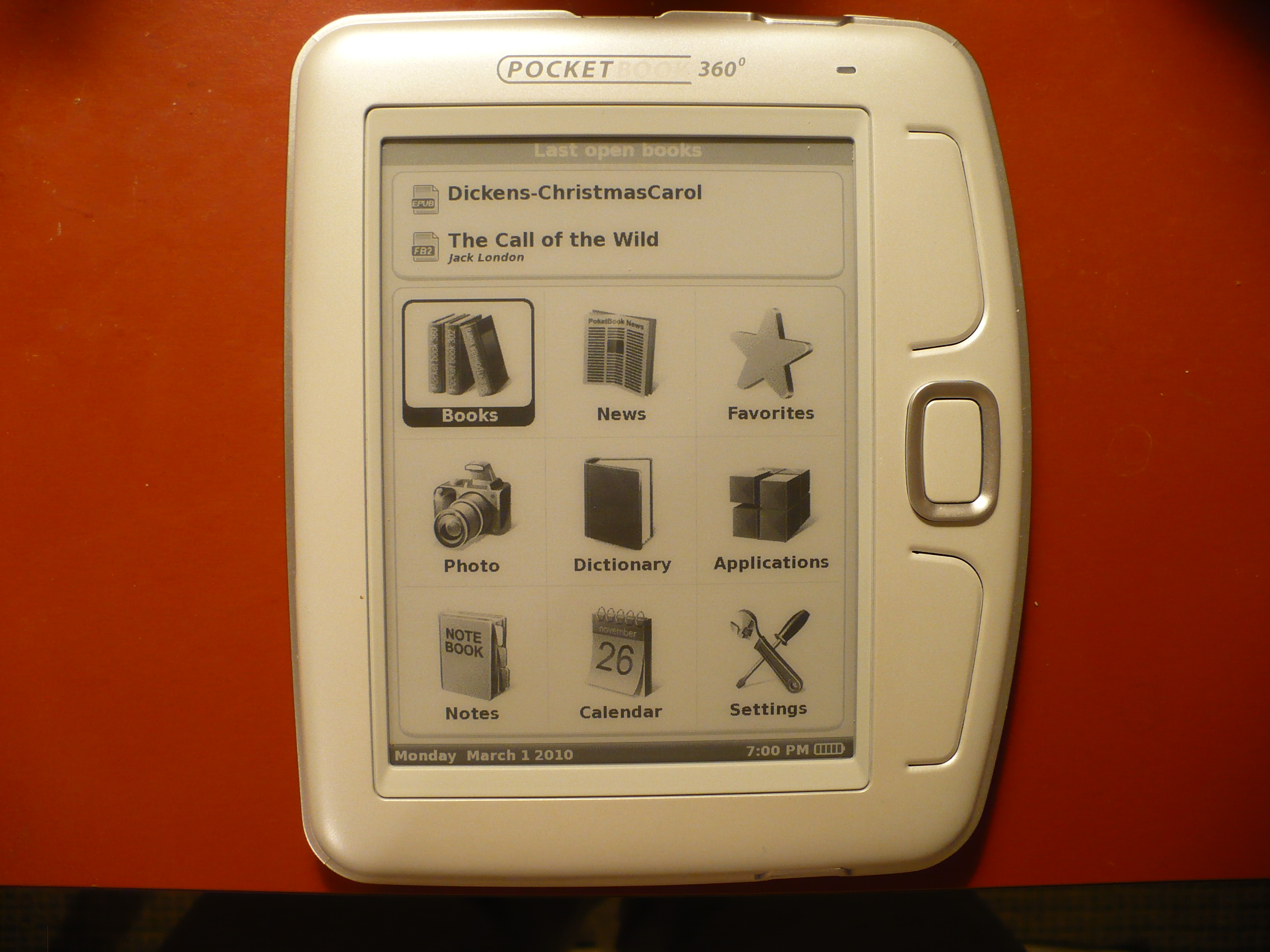 By Roger Pelizzari Ebook readers have been arriving in ever greater tidal waves over the past few years, some loaded with features, others barely able to perform as ebook readers. This January when I began my search, I was looking for one feature, the ability to read books easily, without eye strain. I have no desire to divide my mind with music or the internet while reading. So when my ivory colored Pocketbook 360° appeared before my eyes—lean, light, and beautiful—I had a feeling that it would be a perfect fit. In fact, being the size of a CD case, and weighing a mere 5.3 ounces (half that of the Kindle or Nook), it fit perfectly in my pocket. The 360° is the latest model from PocketBook Global, the Ukraine-Taiwan company with offices in Long Island and Kansas City. It gets its name from its built-in accelerometer which allows for automatic orientation of pages in portrait or landscape mode. The text reflow looks like magic the first time you see it and is a real boon for lefties. The device comes well packaged and opens easily. The detachable hard shell protective cover has a beautiful swirling design and attaches to the back for safe keeping, adding no bulk to the size, unlike most eBook covers. It connects via USB and is instantly recognized on Intel Macs and PCs. You simply drag your files onto the icon. The 360° reads more formats than any reader out there, including FB2, FB2.zip, TXT, PDF, RTF, HTML, PRC, CHM, DJVU, DOC, EPUB, TCR, JPG, BMP, PNG, and TIFF. There is also native support of Adobe Digital Editions, which means you can read DRM protected EPUBs and PDFs as well as free library books. It also supports a wide range of languages, Latin and Cyrillic based and also Japanese, Chinese, Korean, Arabic and Hebrew. EASY ON THE EYES Sporting a 5" E-Ink Vizplex 600x800 166dpi, with 16 grayscale levels, the screen looks sharp, has great contrast and is glare free, perfect for reading books without eye strain. You can take it outdoors and read easily in direct sunlight. With the included FBReader, you can choose one of several fonts or add your own, size them from tiny to elephantine, change the margins and line spacing, and zoom in several levels. SPEEDY NAVIGATION Speed is the word for Pocketbook 360°. Just 10 seconds after booting, you’ll see the menus. Books open in 5 seconds. Flipping pages is as fast or faster than any eBook reader I’ve heard of. The refresh between pages is about half a second, twice as fast as the Kindle or Nook, and hardly noticeable. And that’s with DRM and non-DRM ePUBs and PDFs. Pocketbook’s next version of firmware will add the ability to turn a page with just the flick of your wrist. A turn to the right goes back, a turn to the left moves forward. The 360°s motion sensor will act as a trigger for the page turns. The feature is already available using a custom version of FBReader from: http://code.google.com/p/fbreader-po...76_fbreader180 SEARCHING Simplicity here is a plus. With its large wing-shaped forward/back buttons that give a nice audible click and a very responsive directional joypad, the 360° really flies. No need for a heavy physical keyboard or the glare from a touch screen. The pop-up virtual keyboard works with dictionaries, applications, working with files and creating notes. It’s also a turbo speed searcher. Just a tap of the joypad and a couple clicks and your word is found and highlighted. The 360° always finds your last place in a book, never loses bookmarks, easily jumps to a specific page. MENUS The main menu offers quick access to your two recently read titles, plus icons to take you to eBooks, News (via a Windows-only RSS feed downloader), favorites, photos, dictionary, notes, apps, calendar or settings. Applications included are a clock, a calculator, a dictionary, and games (solitaire, chess, Sudoku, SeaBattle). While in a book, tapping the center of the joypad brings up a quick menu. When reading EPUBS, the lower right hand icon brings up a settings menu for choosing almost any font size. Though not available with PDFs or DRM files, you can still use the up arrow to chose from five levels of zoom. The 360°’s speed covers folder support too with hierarchical and directory structure. You have 3 ways to view content—with icons, thumbnails, or in a list. Flags next to the icons signal whether a book is not yet read, being read, or finished. Comparing to the big boys, the Kindle still lacks folder support and the Nook has a more complicated, split screen personality. SLEEP, SHUT DOWN, AND BATTERY LIFE The Pocketbook 360° has a sleep mode, key lock mode and automatic shut off, but with such fast boots, I just turn it off manually when I’m done. The battery is rated 8,000 page turns, so if you use it 4 hours a day without sleeping or locking the keys, you’ll enjoy 2-3 weeks of reading. Even with the accelerometer activated, long shut-off settings, and an SDcard inserted, you’ll still get over a week of use. And best of all, the battery is user-replaceable, so you won’t ever need to send it in for a pricey replacement, as with the latest Kindles and all Sony models. WHAT I’D STILL LIKE TO SEE Naturally, there’s always room for improvement. Luckily, all three of my suggestions are scheduled to be fixed in future versions of firmware. Pocketbook software engineers regularly read forum suggestions and respond to them. 1. An option for starting at the first or last entry when entering a new module—Books, Pictures, etc. 2. A more elegant way to eject the 360° from a Mac. Right now you have to pull the plug to stop the 360°’s icon from reappearing. One user has already posted a fix that works fine using a free program called Hidden Cleaner https://www.mobileread.com/forums/forumdisplay.php?f=206 3. Macs with PPC processors will recognize the 360°, but only with OS X 10.5 Leopard or higher. FLEXIBLE FIRMWARE The 360°’s firmware is another feature that distinguishes it from the crowd. It’s com