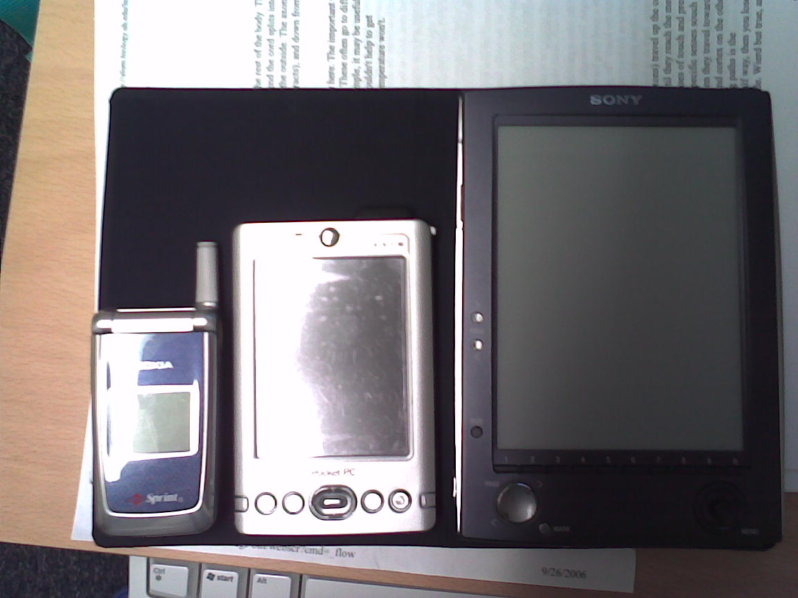 Comparing some devices since Crono already got the book-size angle. I only have textbooks lying around anyways, which are huge compared to the Reader. First image: From left to right (Nokia 3155i cell phone, Dell Axim x30 PPC, Sony Reader) Second image: From left to right (reverse of the above order) |
