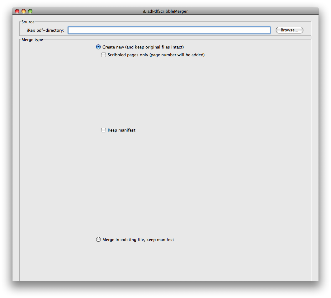 Your java tool would convert my iliad into something really useful. But, I havent been able to get it to work, and I hope you might have some insight. I downloaded the .jar and launched it with java -jar. I get a nice window with two dialog boxes on top and bottom and the color mapping console. However, if I browse to the directory that contains the irx files it does not show that directory in the text box "IRex pdf directory". It will display the directory if I manually enter the full path. On the other hand the browse option works for the destination path Anyway, if I fill both boxes, and then click merge nothing happens - no error messages, no files generated, just nothing. Anyhelp on how to debug this would be appreciated. |