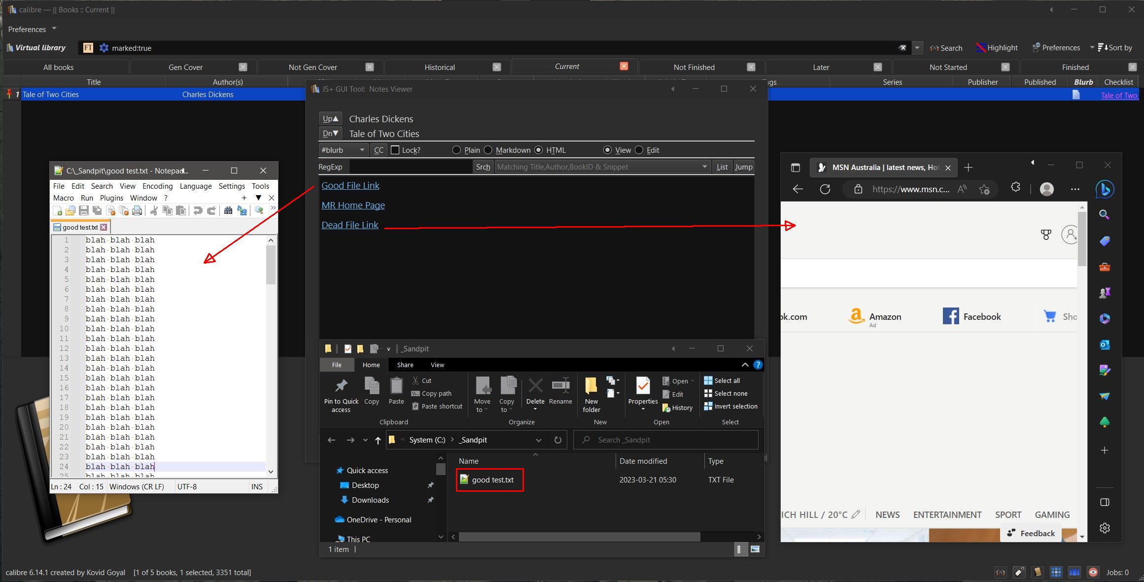 Here's what happens when I click on the two file links: The file:/// link to the non existent C:\_Sandpit\dead test.txt file, opens a browser (Edge) - I would expect it to do nothing (a'la Book Details) or better yet pop a message - "File doesn't exist". BR |