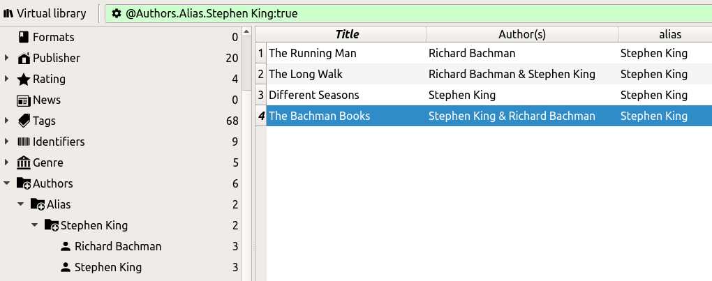 it is possible to separate the aliases like in the normal authors (black instead of blue ampersand)? I have a group-search "pen-names" with authors and #alias and do my similar authors search by this pen-names. If I search for "Robert Lynn Asprin" all the books with Robert Asprin & Co-Author will not be found, because the alias is e.g. "Robert Lynn Asprin & Linda Evans" and not "Robert Lynn Asprin" & "Linda Evans". I hope I expressed it clearly |