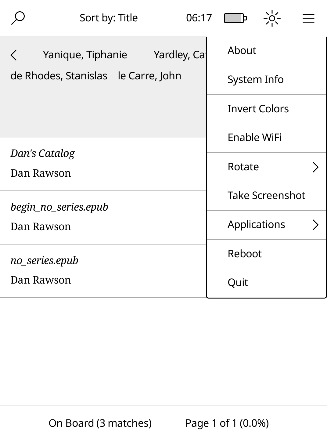 When I initially start plato from Nickel Menu, there is NO selection in the navigation bar, and the shelf is sorted in "Date Opened" order ... so I see my most recent books at the top. However, once I've done a search or made a selection in the Navigation Bar, there's no way to clear it. The only solution is to exit back to Nickel and then re-start plato. Or am I missing something obvious? :-) Thanks! Dan |