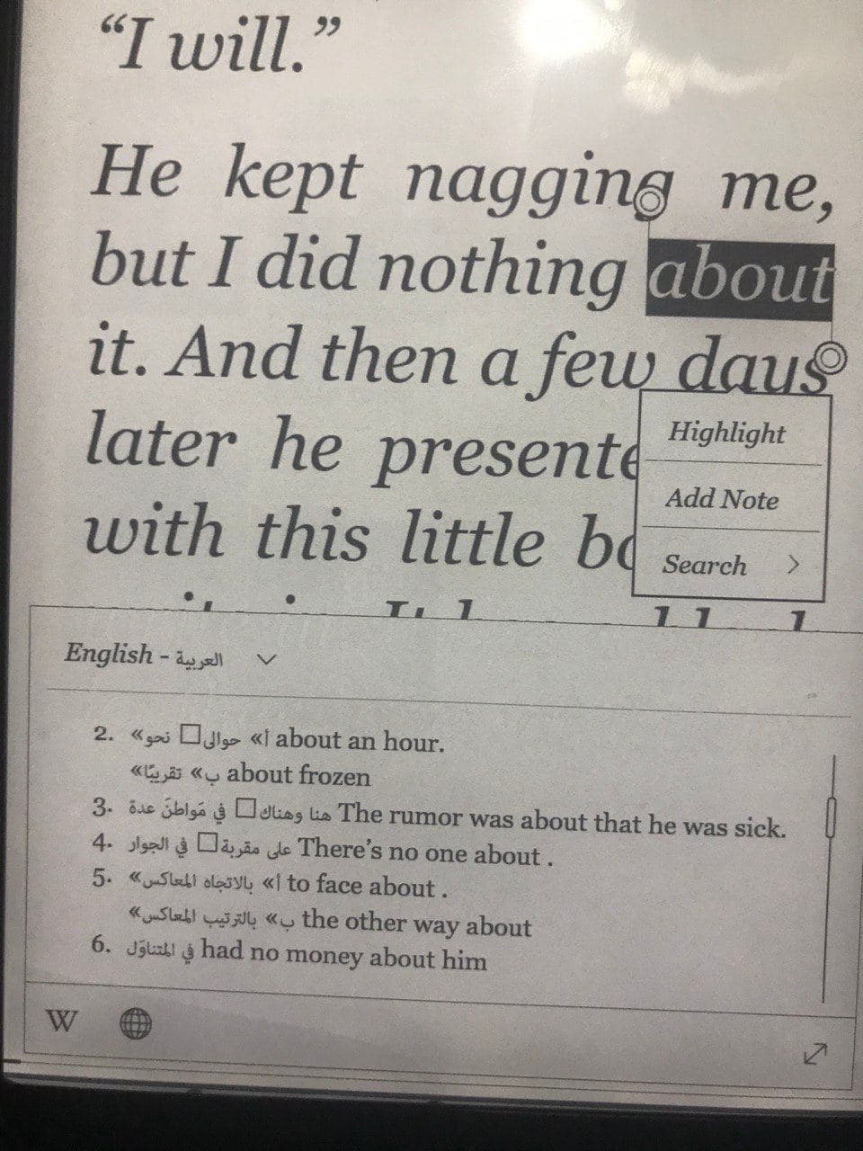 dicthtml-ja-en.zip (38 MB) Documentation and installation instructions: http://perm.cessen.com/2021/kobo_dictionary/index.html This dictionary is generated from scratch from free dictionary sources, and can therefore be freely distributed. It's also complete with pitch accent information, and has an index that matches conjugated verbs and adjectives when selecting words, which I had trouble with when using other dictionaries. As far as I know, this is a major improvement over previously published Japanese-English dictionaries for Kobo e-readers. I certainly searched hard before putting the time into making this. I hope it's useful to other people! (I'm also planning to release the source code for the tool I wrote to generate the dictionary, which has additional options for people that want something a little more custom (e.g. also including Japanese-Japanese definitions). But I want to clean it up and document it a bit first.) |