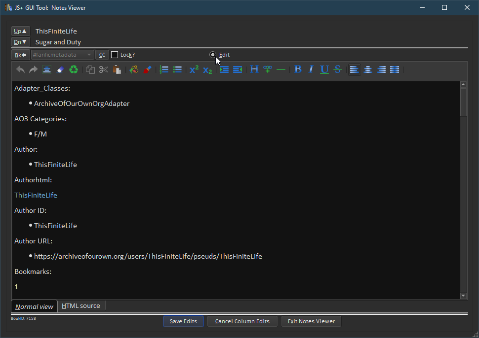 Version 1.0.232 -2023-04-13 Notes Viewer: Added the Name of the Source of the Sort Value after "Sort Value" in the Sort Value Column in the Search Results list. Add current BookID in lower left of NV window. New full HTML Editor. The "To HTML" (previously "HTML") button now converts Plain Text to basic HTML, and Markdown Text to its full HTML equivalent. Shortcuts and Context Menus now broadened in their ability to be triggered, and their responsiveness when triggered has been improved.