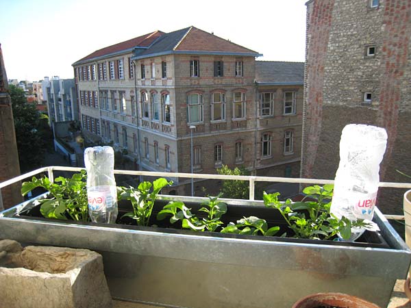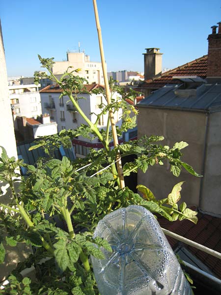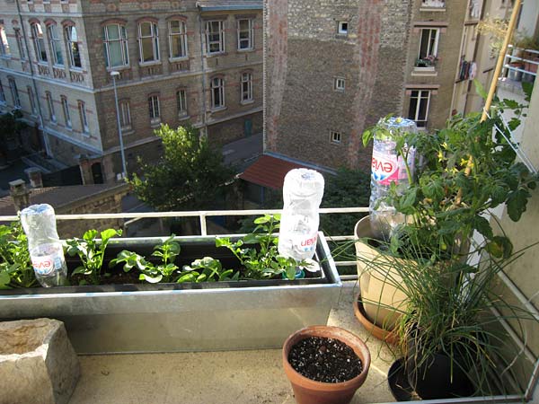 I am deliriously happy! I just came back from a three-day week-end with my parents, and I was half expecting a window-sill disaster. I very hastily set up an irrigation system before I left on Friday morning, and apparently it worked. Not only are my plants healthy, but the rocket has grown like crazy, and there are now tiny little tomatoes
