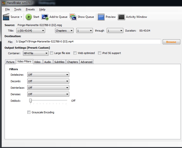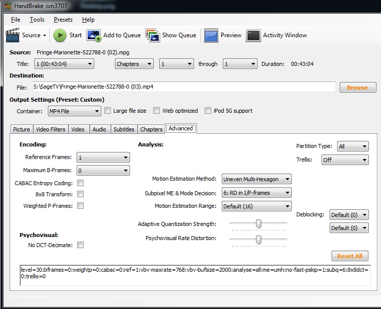 - I'm about to encode an HD television show, Fringe, a single mpeg2 file with commercials pre-cut using other software. - The native HD resolution of this video file, as shown by Handbrake on the "Source" line is 1280 x 720. That's too big for Nook, so we'll need to scale that down (Nooks max resolution is 854x480). You'll probably need to select "none" on the Anamorphic pull-down, and then be sure "keep aspect ratio" is checked, and then manually set the Width to 854. When you leave the Width text box and it looses focus, Handbrake should automatically set the Height. Note: if the height at this point is 480 or less, you're set, but if it's more than 480, you'll need to set the Height text box to 480 (Handbrake should then reduce the Width text box accordingly to hold aspect ratio). No matter how you look at it, the Width should never exceed 854, and the Height should never exceed 480. If your source video is a DVD file, or something with a lower resolution than 854x480, then I believe it will not allow you to use a larger resolution than the source, so your final numbers might be something like 720x400. - In the cropping section, I usually set Handbrake to Automatically crop. Once you get to know Handbrake a little better, or if you have artifacts on the edges of the encoded video, you can start to fool with the manual cropping. - IMPORTANT - you also need to look at the "Destination" path of where it's going to store the file, and what it's going to call it. I believe that it will default to putting the video in the same location as the source file, however, if you've run Handbrake previously, it may put it in the previous directory. Regardless, you can click on the "Browse" button and put the destination file wherever you wish, and change the filename here at the same time if you want to. Last edited by KryptoNyte; 12-21-2010 at 10:25 PM. |