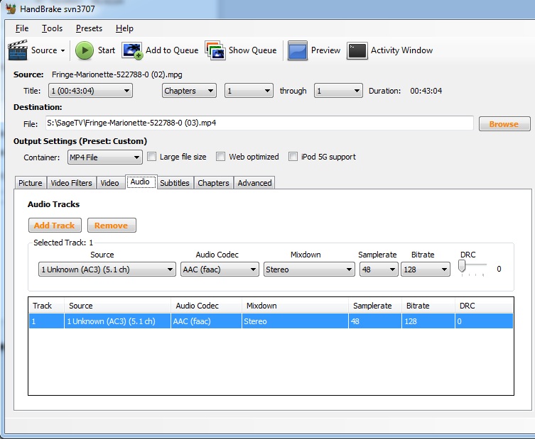Now, we have no idea what your source's audio is going to be. Heck, in that little pull-down under the "Source" heading, Handbrake might list 1, or maybe 5 or 6, maybe even in different languages, maybe 4 or 5 in different languages without even telling you which is which. Pick the one you want, or guess if you have to, you may need to return to this if you end up with the wrong language in your encoded video. Set the remaining pull-downs as I have shown. Once all set, hit the "Add Track" Button. This should now populate the little chart at the bottom with your new line item with the same settings that I'm showing. |