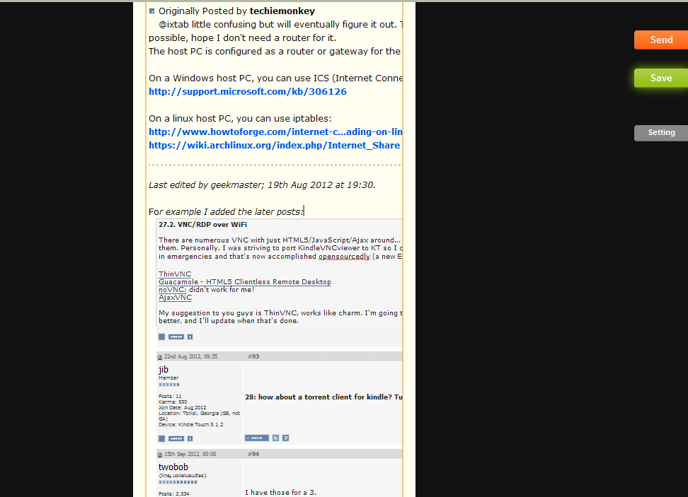There are numerous VNC with just HTML5/JavaScript/Ajax around... and here I'm going to introduce some of them. Personally, I was striving to port KindleVNCviewer to KT so I can use Kindle as a screen for my laptop in emergencies and that's now accomplished opensourcedly (a new English word ).ThinVNC Guacamole - HTML5 Clientless Remote Desktop noVNC: didn't work for me! AjaxVNC My suggestion to you guys is ThinVNC, works like charm. I'm going to make Guacamole and ThinVNC better, and I'll update when that's done. |