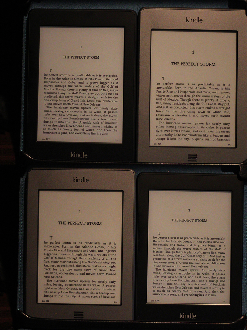 Here are some comparison photos. Warning, photos of eInk readers are not what our eyes might actually see. I did side by side comparisons with the PW on the left and the Touch on the right, then I reversed them, took a second photo at about the same angle and settings.