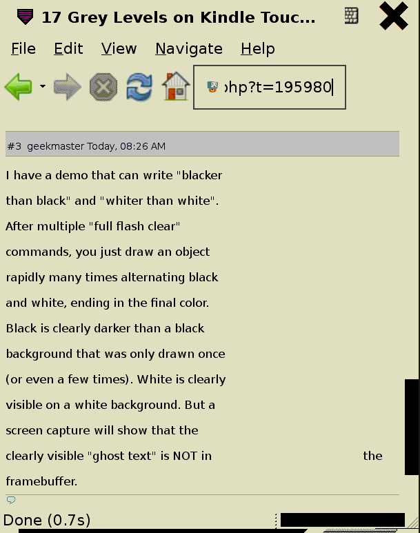 ![]() yeah, it really still would be nice to have an option for the native browser to support it but meh. Fun to play with. OT: I did get vlc player running very nicely - with surprisingly great eink management, would have to port it to get the sound going I would imagine : ) playing with games right now. finding out what runs decently before wasting effort on a port. Happy fun. |