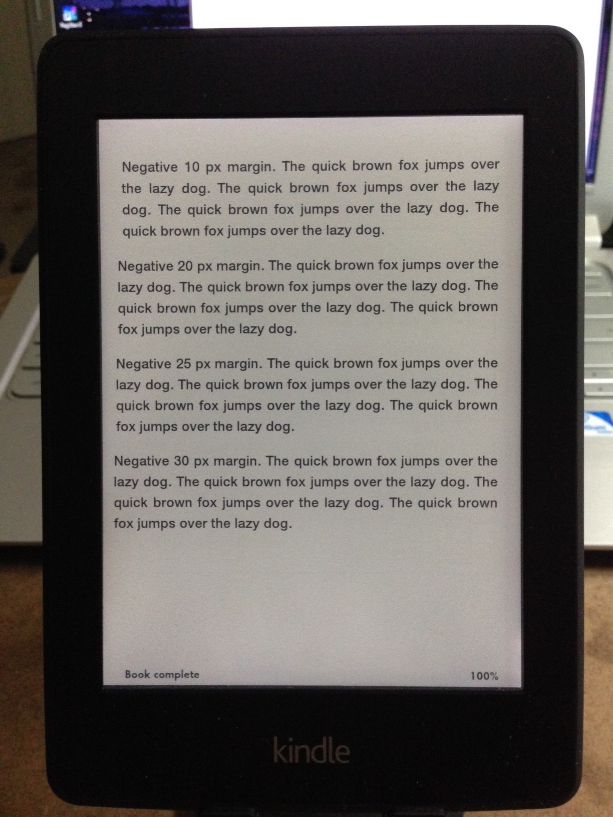 FYI, kindle pw2 obeys negative margin-left(right), so you can use it to reduce blank space on the sides, if that is what floats your boat (does mine). Hey, as long as I'm converting to embed font anyway, may as well dig in and tweak, right?