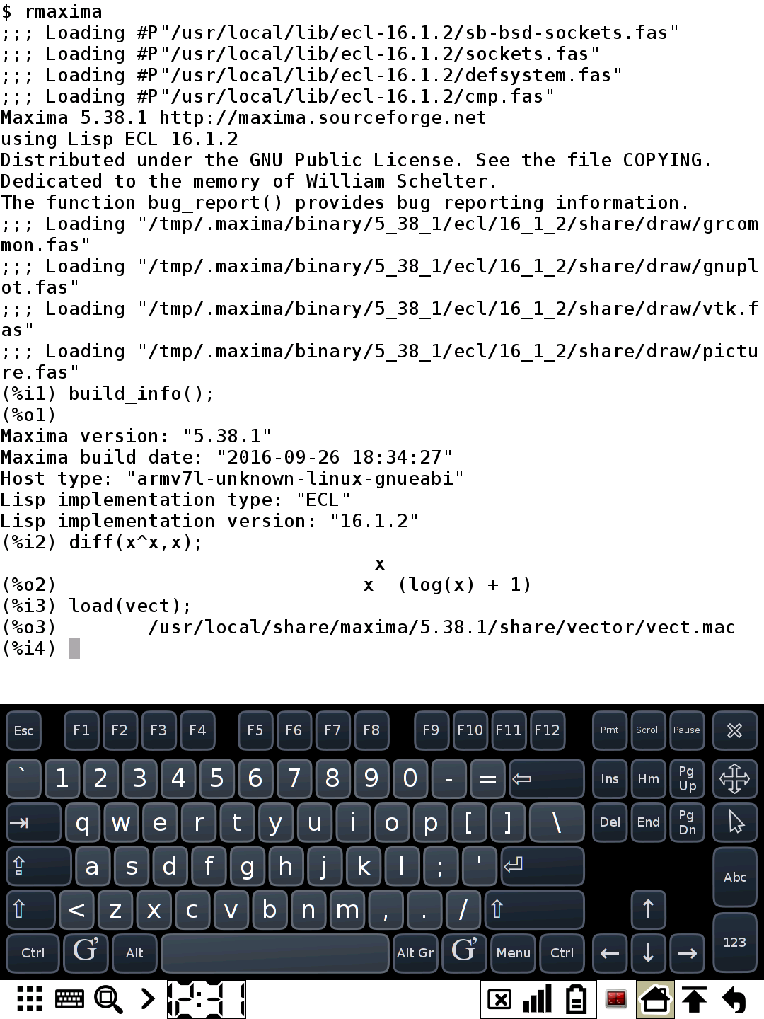 I have compiled Embeddable Common Lisp (ECL) 16.1.2 and then compiled Maxima 5.38.1 on Kobo Aura HD. It works perfectly, even plotting works. Screenshot is attached.
