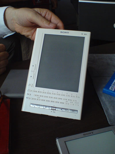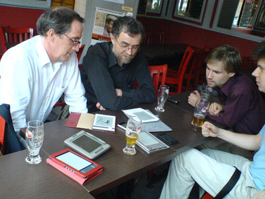 the sony device is the Librié, which was the precursor to the current sony readers. unfortunately we couldn't play with it, because the battery was dead, but it was interesting to see it. sadly, i don't get to keep the cybook, but well, you didn't really think i would, did you ? i do have it for a few more days, however ; i'll give it back to pauline this week, when we meet up to take a look at the Orange Read and go device. it was really incredibly nice of bookeen to lend it to me, anyway ! and i certainly did have a great time playing with it ! |