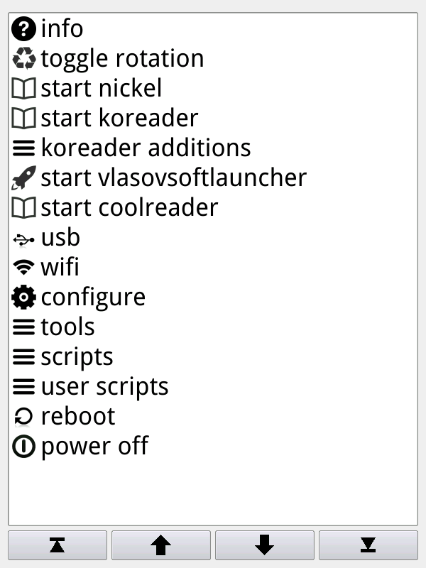 suppressEntries=+info+toggle_rotation+start_vlasovsoftlauncher+koreader_additions+usb+wifi+configure+tools+scripts+user_scripts+reboot+power_off+ Then select this line via "configure". The images below show the effect on my device using the "suppressEntries" value from above. Image 1: before the installation and configuration Image 2: after the installation and configuration Image 3: after toggling between full and short menu. In the spoiler is a list of the suppressible items: Spoiler: