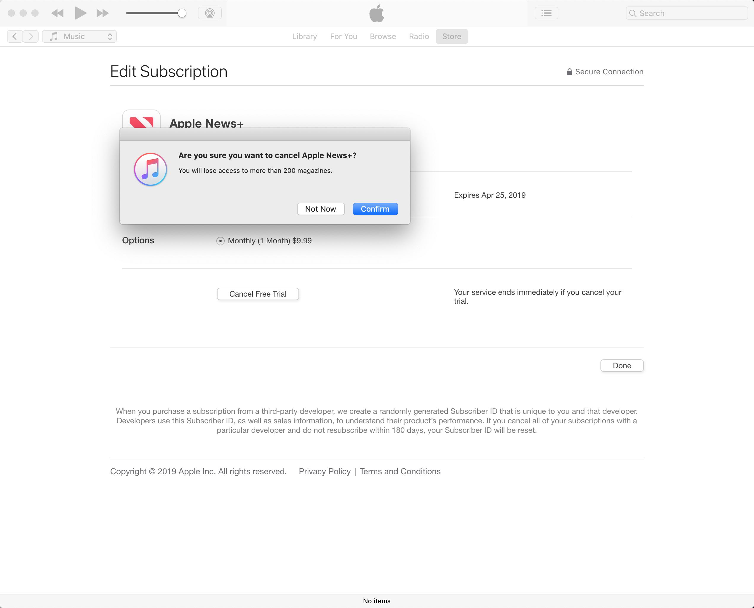 Don't forget to cancel your News+ trial subscription before it expires, unless you want to keep it. I don't think I even checked it out more than a day or two. I simply don't want or need it, so I cancelled mine today.