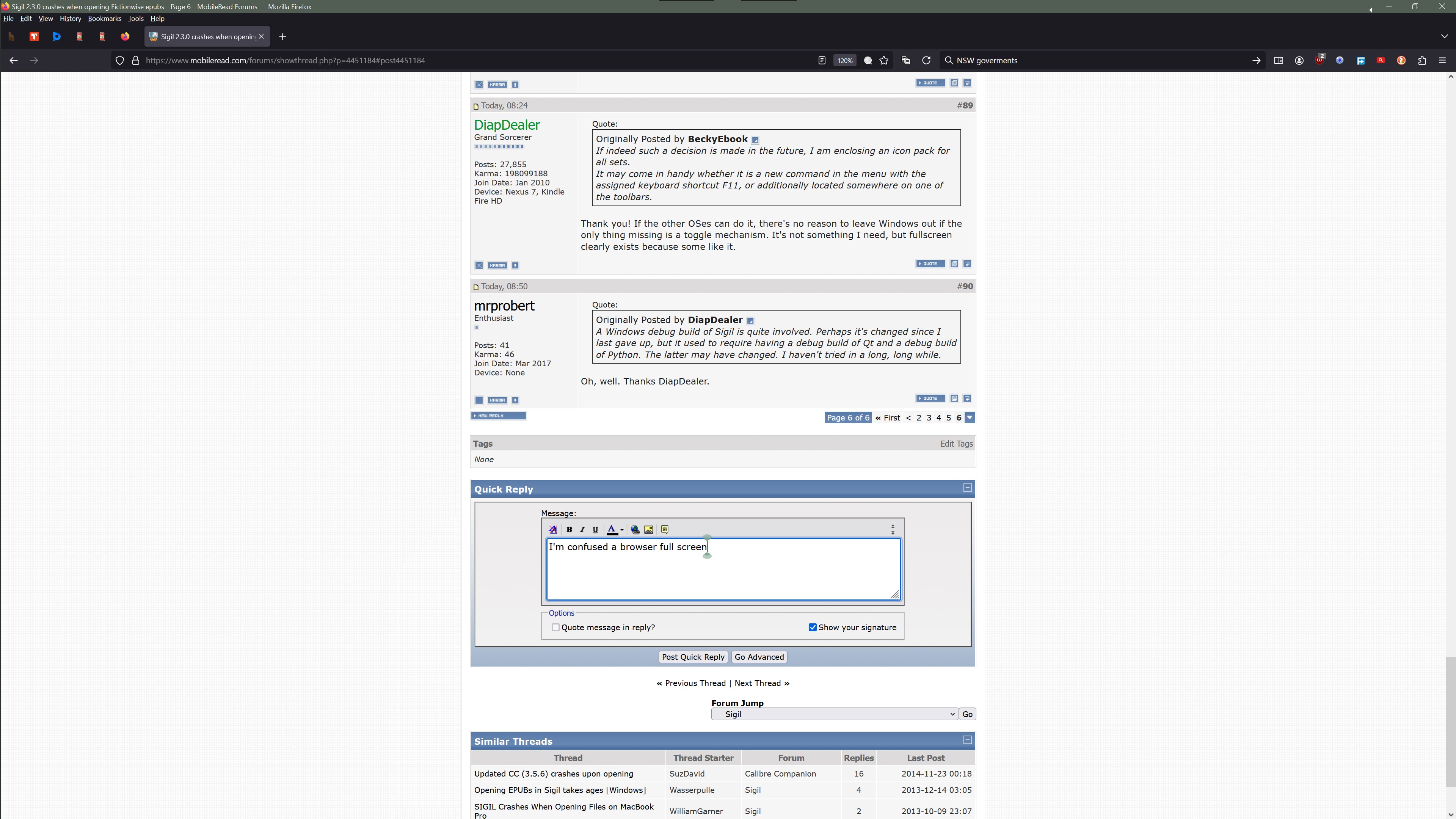 ![]() @BeckyEbook posted some screenshots a while back, and I'm looking at Sigil in fullscreen on Linux right now. It loses its titlebar and hides a taskbar if present. That's about it. Fullscreen and kiosk mode are not the same thing. You forgot to mention that it only makes sense to you (and me for the most part). But we all need to learn that our use cases are not nearly as "standard" as we might want to believe they are. We've given Sigil scads of features over the years that I have absolutely no use for. *shrug* Last edited by DiapDealer; 09-06-2024 at 09:09 AM. |