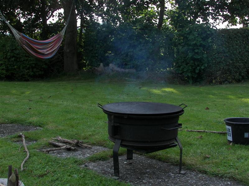 The first is the setup. It's made from an old lorry tire rim (if that's the correct word). The baking plate is also made from the same material. Ok, put some oil in and then the batter (the brown rim on the batter is the oil). put the cheese on and the (slightly pre-fried) bacon. Wait a bit and pour a second (much thinner layer of batter on top of that. Turn it around, wait a minute or so and put it on your plate. Result on the third picture! Yummie! (naturally, if you actually bake in a baking pan, you'll get much rounder results )
