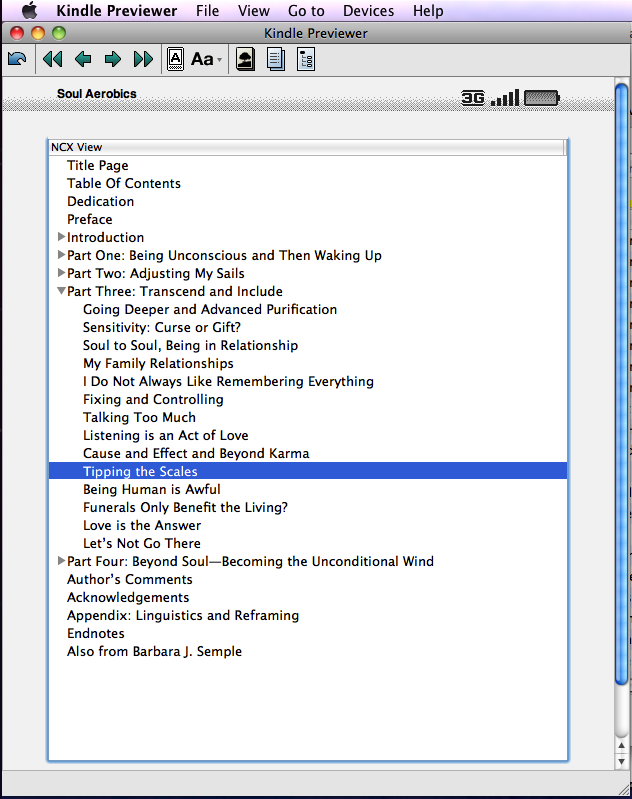 Note that properly formatted Kindle content is supposed to have 2 TOCs: - the HTML TOC found at the beginning of most books that resembles that found in print books. This is where MENU/Go To../Table of Contents takes you, but it can be a number of pages long and tedious to navigate, and while doing so you are in danger of losing your 'furthest read' position. - the NCX TOC that defines navigation points with in the book (accessed with right/left joystick). This is a hierarchical structure, and is identical to the one used in ePub format when you click on the reader's TOC button. Many older books in the Kindle store don't have one of these. I'd like to see a button that pops up a window with the NCX TOC (say 'ALT+T'), listing all section/chapter labels, and with the current section highlighted, and representing hierarchy if one is defined. Simple up/down would allow navigation to another section (scrolling automatically if necessary), and you could also enable type-through to filter the item list down for more efficient selection of the desired section. It is interesting to note that the Kindle Previewer application (a free app Amazon provides to people preparing Kindle content) does have such a function in it, as seen in the screenshots below (taken after the 'NCX View' button is clicked). (one has hierarchy, one is flat) |