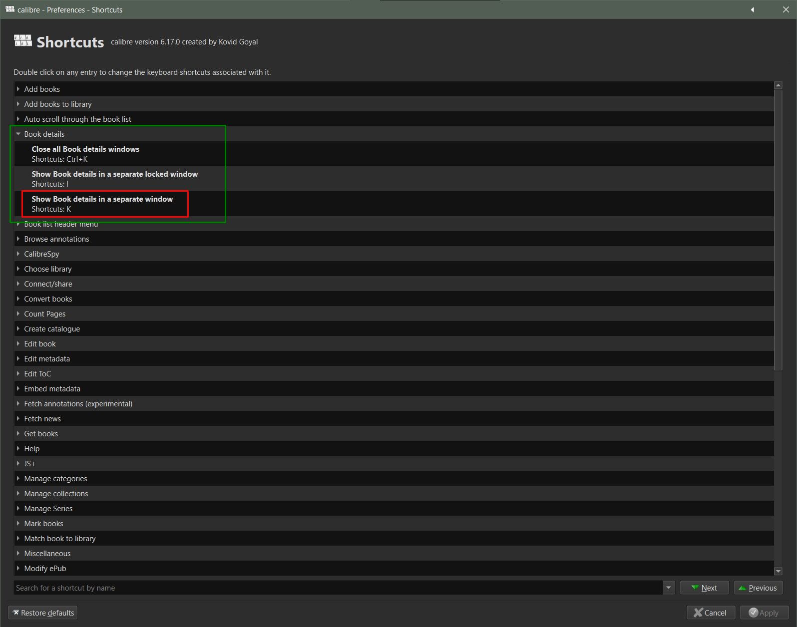 Observe the Group name, as expected its "Book details", which matches the name used in Preferences->Shortcuts: When I change the 'Show book details in a separate window' from 'I' to 'K' I see this: Observe the change in Group name: it's the same as the shortcut name. When I add the custom shortcuts for the other two options it changes again: Here's a snippet from ...\shortcuts\main.json Code: