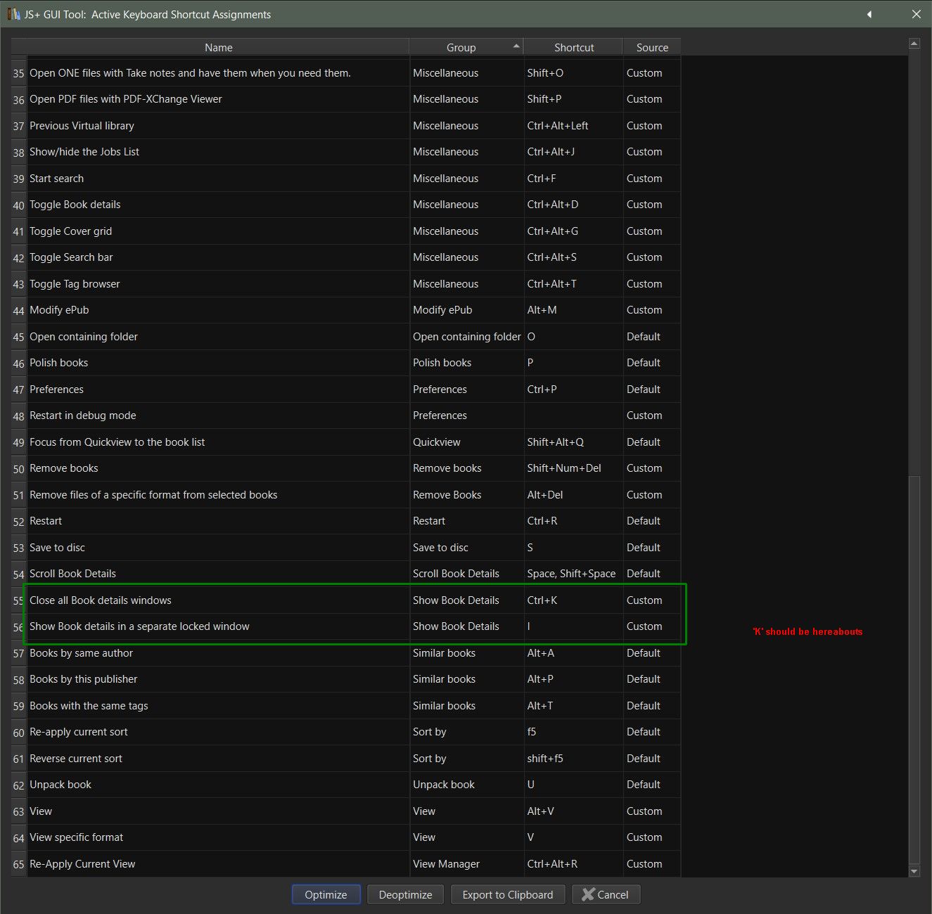 You might ask him how he enabled 'K', given the above. I guess it could have been made a transient override that only exists when the Book Details are open; if so, it would not be in the official shortcuts source, meaning that the JS Tool cannot show it. DaltonST  |