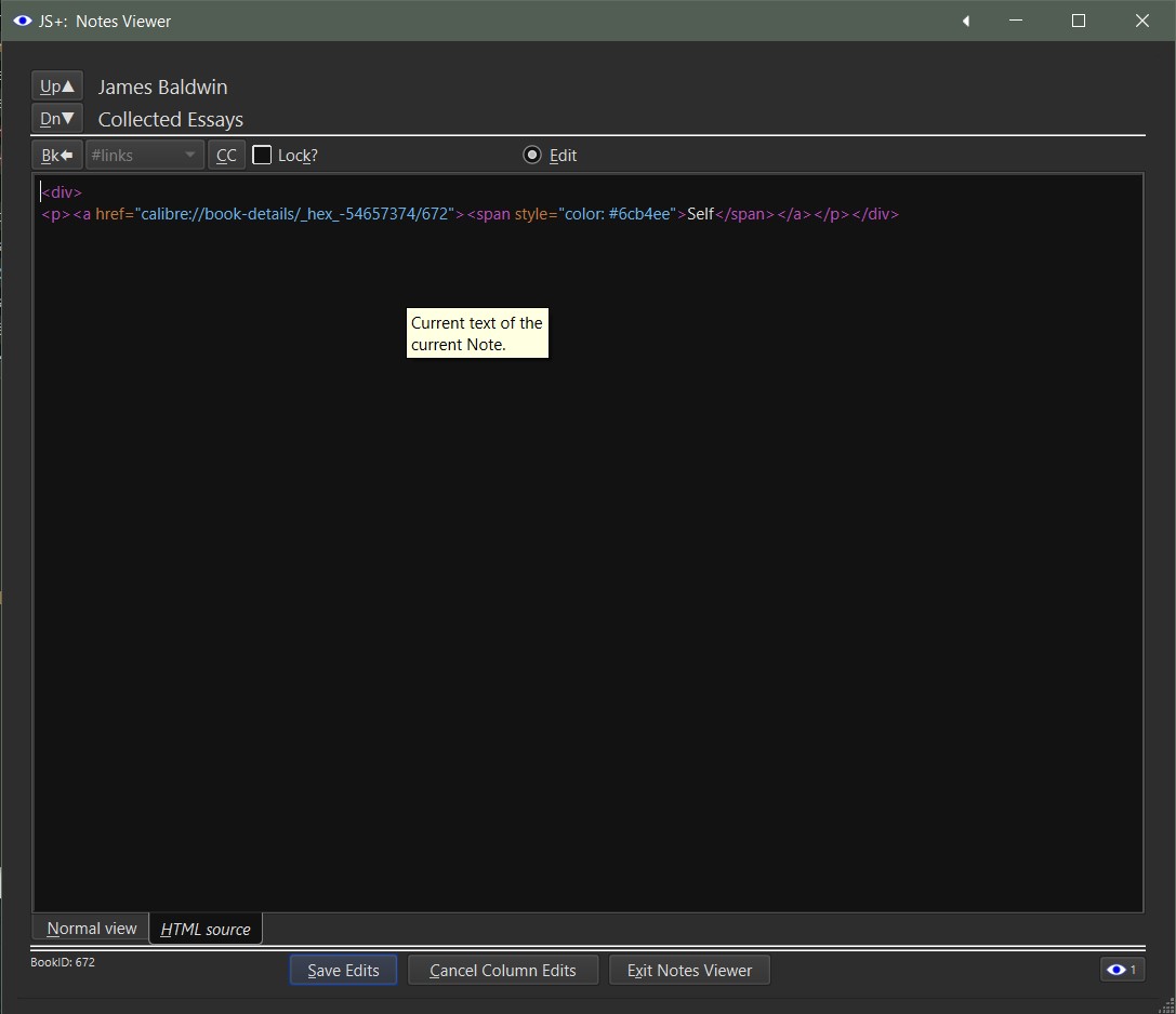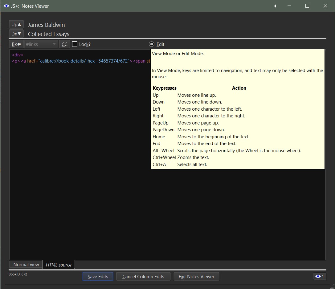 I question the utility of the first tooltip in Edit mode. I also question why the Lock checkbox and Edit radio button are even shown in Edit mode, they don't do anything useful. If I check Lock before I edit, then after saving the edits and returning to View mode the Lock checkbox will be unchecked. Bug, maybe - I don't make use of the Lock feature. A single radio button is meaningless. so I assume Edit button is there as a hint as to which mode you're in -- in which case it doesn't need a tooltip. But getting into NV's Edit mode is hardly something anyone is going to blithely stumble into. IMO, NV's navigation controls are unnecessary clutter in Edit mode. If one uses them NV quite rightly asks if you want to discard the edits. If you do then you should have used the Cancel button, which will take you back to View mode.   If you want to keep the edits then you must use Save which will take you back to View mode. If you click Down in Edit mode and discard the changes you end up in View mode for the next book - you could have done that by Clicking Cancel and Down. See third screen shot. BR  |