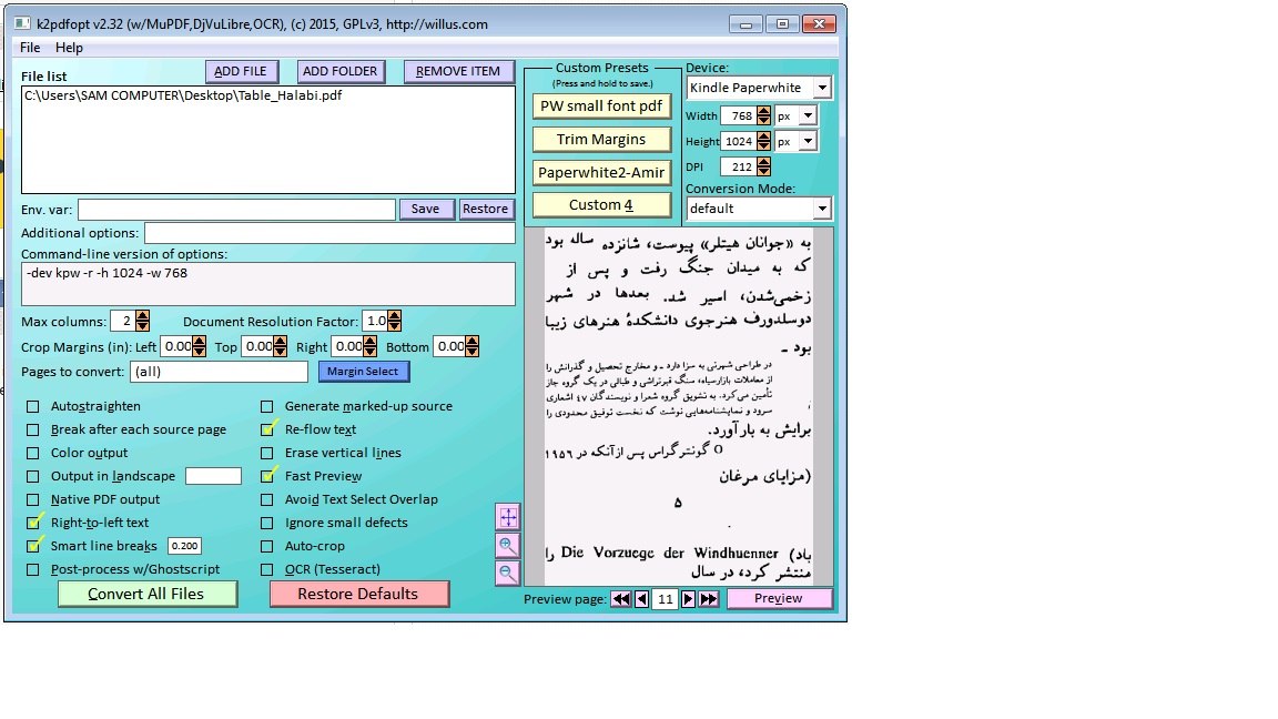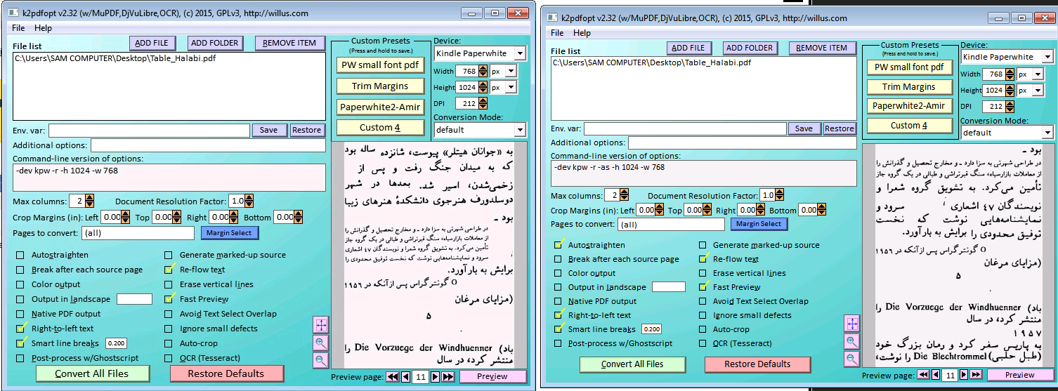Hi willus By changing the setting for Paperwhite the quality increased a lot. Thanks for your good software that after reflow solved two basic problem of Paperwhite; missing letters and bad quality of scanned pdf. Have a good day |