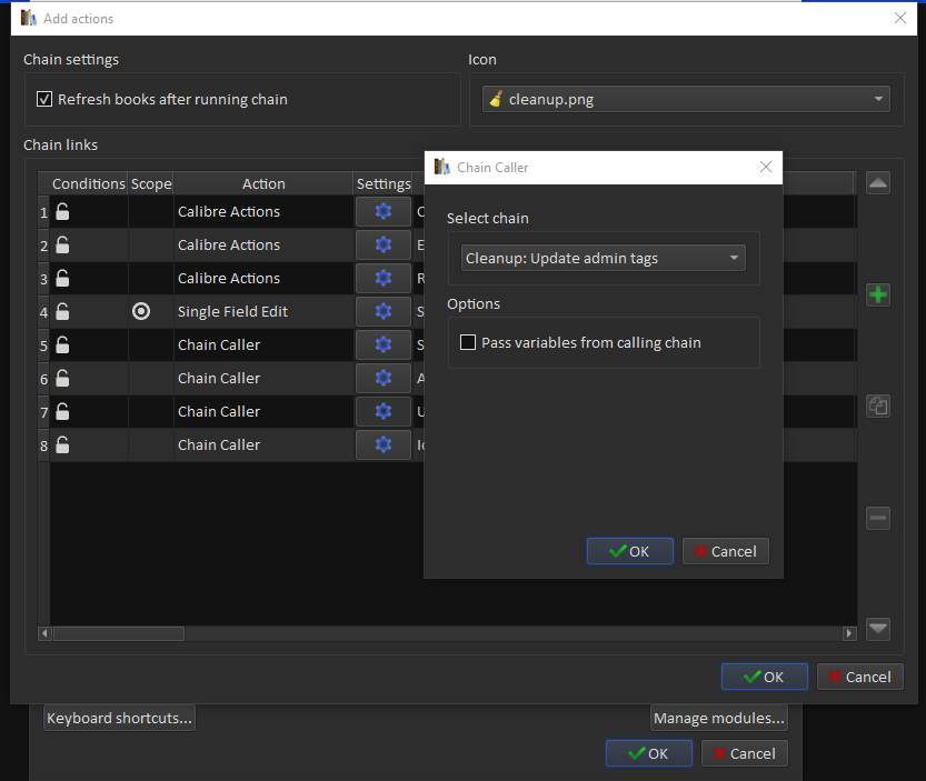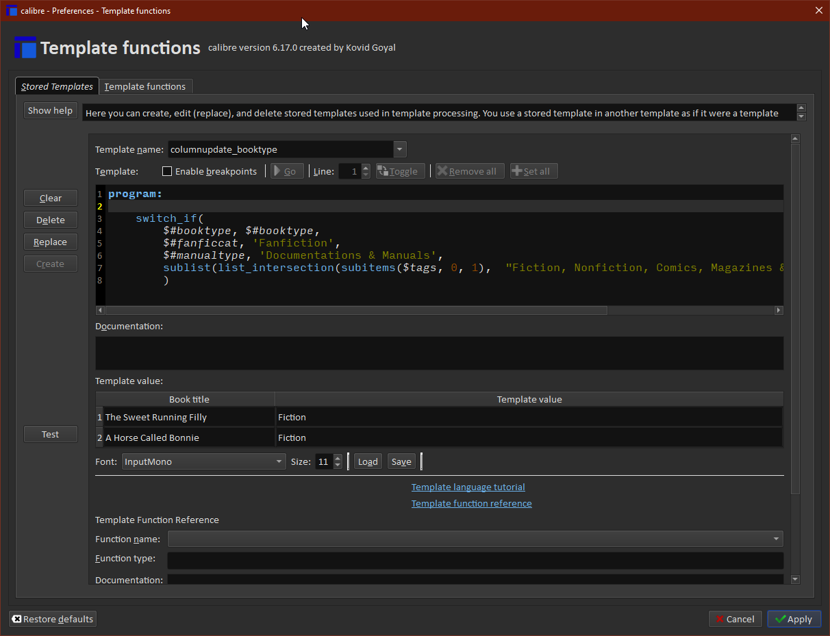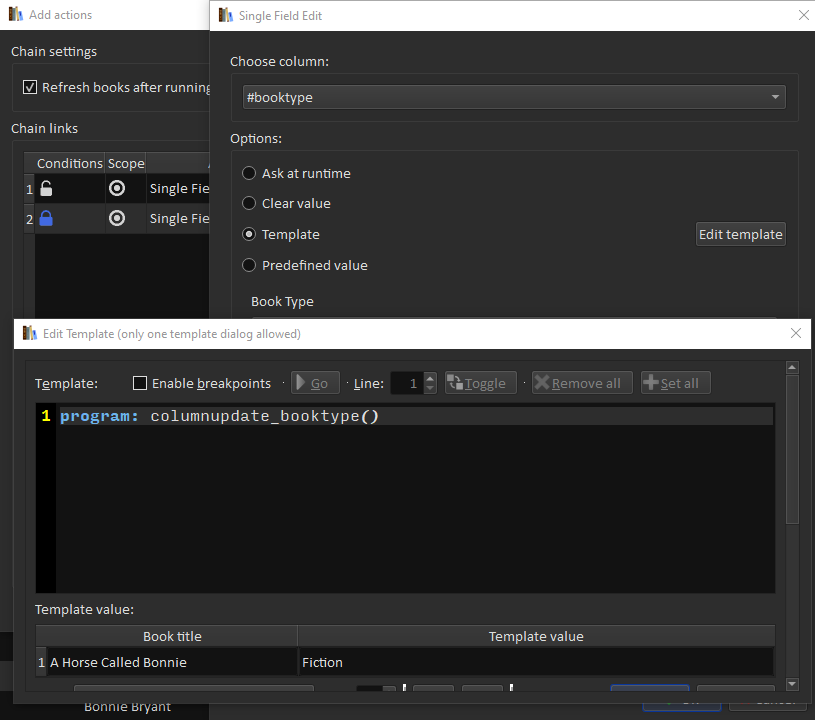 This will enable a 'Chain Caller' action which lets you run another chain. It's a little slow as there's checks for recursion to prevent it getting stuck in an endless loop. Note: While doesn't seem to be the case here, this may be useful later on: if the reason for using chain-caller is to avoid duplication of templates used for Single-Field Edits, you can use a stored template (Calibre Preferences > Template Functions > Stored Template tab). As it skips the recursion check, using a stored template in the SFE is faster than using chain-caller on a single-action chain used to hold the template: Last edited by ownedbycats; 05-24-2023 at 03:20 PM. Reason: Add info on stored templates |