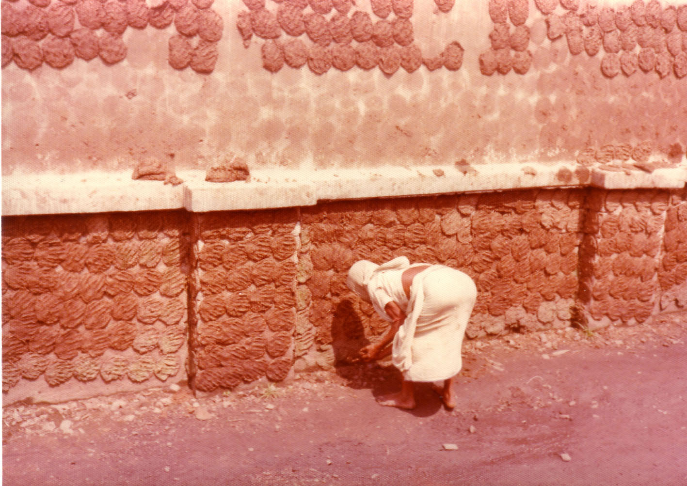 I took this snap in Calcutta way back in 1976 - an old lady recycling cowpats to be used as fuel for fires. Note the clever use of (free) solar power. |