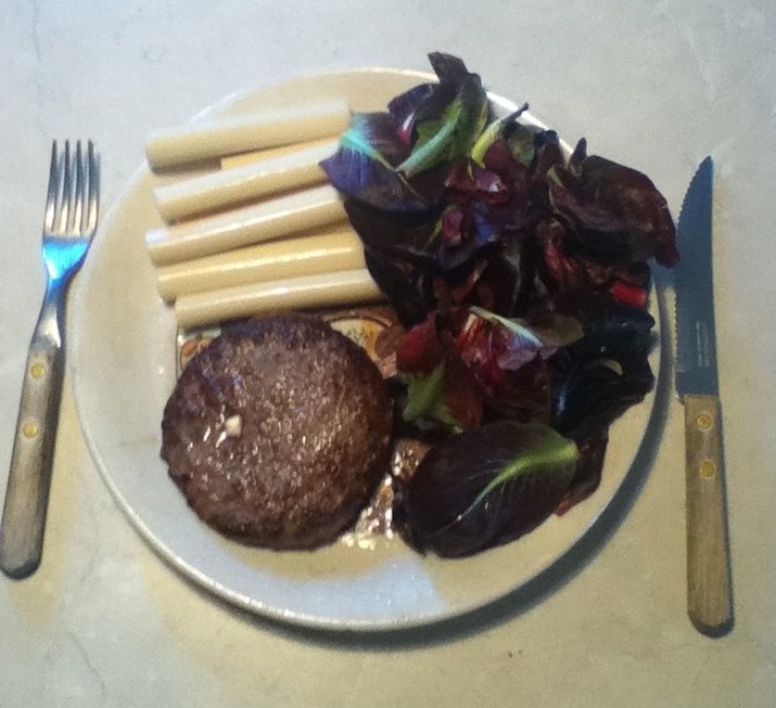 It's beef. Palm hearts substitute bread. The salad is chicory, without seasoning, not even salt. That chicory is almost wild and is common for the whole winter, it is enough some sort of shelter. It is bitter and crisp. Very very pleasant. It exists in a green and in a red variety. It is best with boiled eggs. I do not use eggs really, so it's an Hamburger steak. Without gravy. But, I just remembered that in Quebec they use a tea gravy! Next time. It goes on the line of bread pudding and the like, just to stretch the week, the fortnight, the month, the season, the year, life. Stretch, stretch, ... Lucky me, lucky us. |