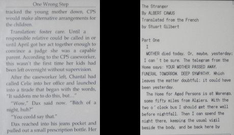 Here are the first photos of the Bookeen Cybook Gen3 and the Netronix EB-100 side-by-side. In the landscape image (horizontal) you're seeing the Cybook's Library and the EB-100's Menu screen. The portrait (vertical) image has a page from Griffin's "One Wrong Step" (Cybook) and Camus' "The Stranger" (EB-100). The EB-100 is set to the smallest font size and the Cybook to the font size I typically use - the EB-100 has four larger font size increases, call the largest about 36pt or 1/2-inch-tall characters. I know it doesn't really "show" in the photos, but the EB-10 appears a tad bit more 'contrasty' to my eye - maybe 10% or so. Derek |