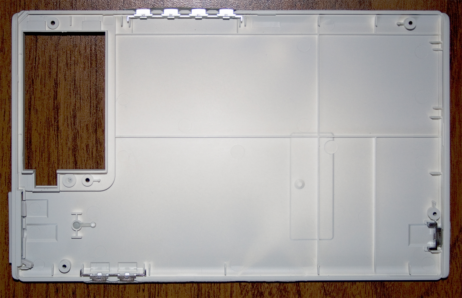 So I decided to take out the rubber "plugs" from the back of my EB-100. Counting the two screws in the battery compartment (note that the battery's number is clearly visible), there are five screws holding the back panel on. I'm going looking for the serial port connections so I can do a direct PUTTY of some firmware from my PC. Gotta build a TTL-to-USB cable first.