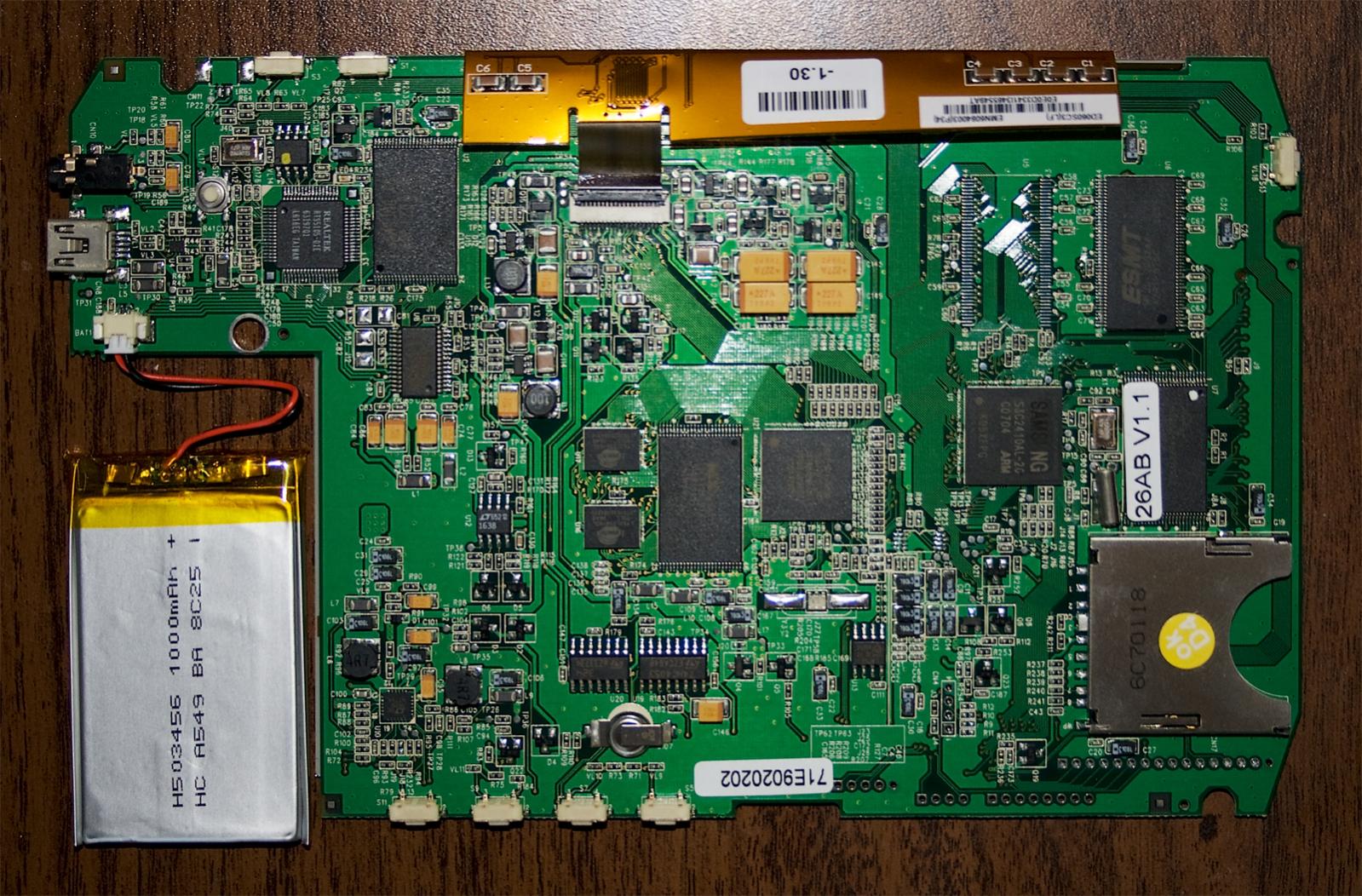 The first is of the EB100 with the front panel removed and set to the side. The second is of the inside of the back panel. The third is of the display side of the CPU board. The fourth is of the chip side of same. The fifth is of the CPU board from a Cybook Gen3. Note that except for the 1.1 revision on the display connector from the Cybook Gen3 and the 1.3 on the display connector cable from the EB-100 (which was purchased much later - just two weeks ago) they are the same. Derek |