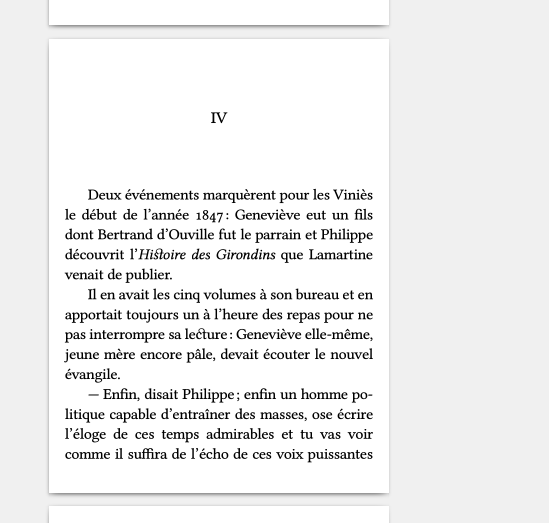 @font-face { font-family: serif; src: local("Droid Serif") } */ @page { size: 9cm 12cm; margin: 5mm 1mm 1mm 1mm !important; @top-left { font-size: 30%; font-style: italic; border-bottom: solid thin black; margin-bottom: 1mm; content: string(booktitle); } @top-center { font-size: 40%; font-style: italic; border-bottom: solid thin black; margin-bottom: 1mm; content: string(chaptertitle); } @top-right { font-size: 30%; border-bottom: solid thin black; margin-bottom: 1mm; content: counter(page) "/" counter(pages); } } @page:first { margin: 1mm 1mm 1mm 1mm; @top-left { border-width: 0; margin: 0; content: normal; } @top-center { border-width: 0; margin: 0; content: normal; } @top-right { border-width: 0; margin: 0; content: normal; } } body { font-size: 18pt; font-family: Amasis30; text-align: justify; prince-image-resolution: 166dpi; hyphens: auto; string-set: booktitle "@{@{title}@}@" author "@{@{author}@}@"; } I do not succeed to correct it, except manually on Foxit (but it is fastidious). Any possibility to adapt my (clumsy) configuration ? Thanks. Last edited by Jellby; 03-11-2019 at 03:25 PM. |