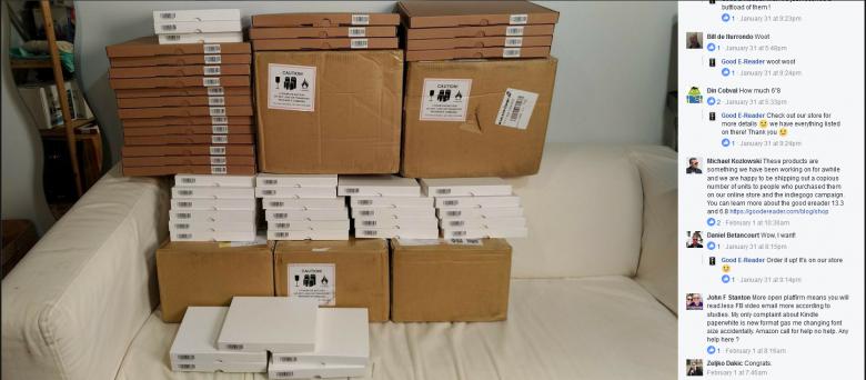 https://www.facebook.com/Goodereader I haven't seen any indication of backers from their Indiegogo recently receiving any devices. Previously, people would often post comments when they got their tracking number or their product. Still amazes me that they would ship to any new customers before fulfilling all the existing orders from the Indiegogo campaign. Especially since Michael initially claimed that they had temporarily closed their Indiegogo campaign so that they could better concentrate on fulfilling their existing orders. (That was before Peter let it slip that their campaign had been shuttered. And before people discovered that they had quietly started offering their devices on Amazon and on their own website.) Quote: