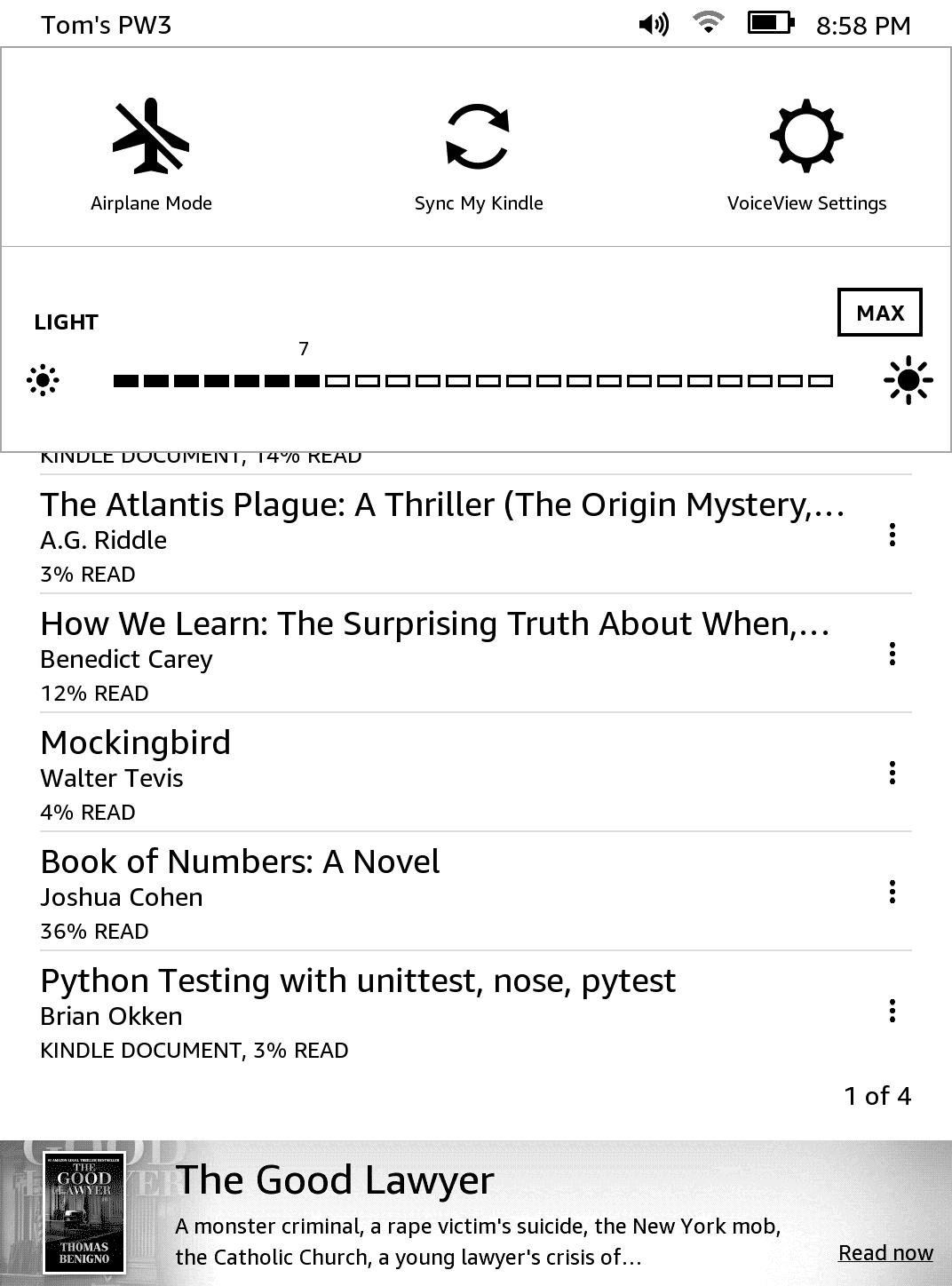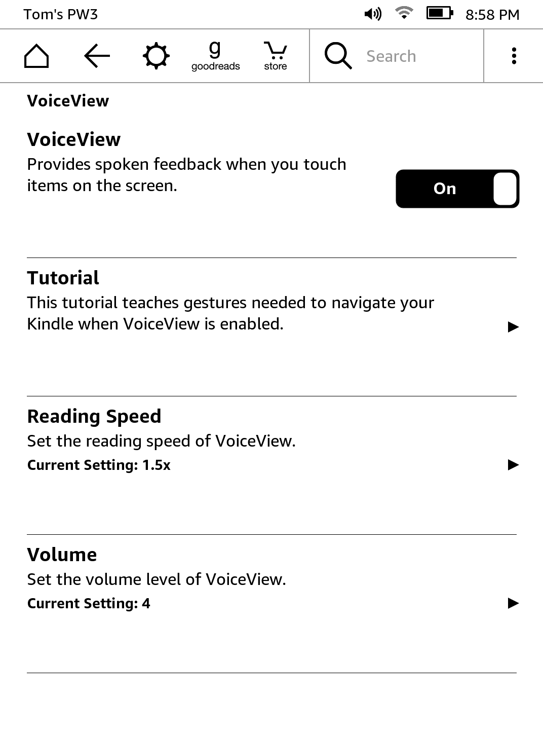 In VoiceView settings you can toggle VoiceView On and Off, engage a Tutorial, adjust Reading Speed (from .66x to 4x with 8 intermediate speeds), and Volume (from 1 to 8, default is 4). It is significantly simpler than VoiceView on the Fire, which after all is a more complicated device. Not as many fancy gestures to learn. The Tutorial takes you through everything in less than five minutes. Keyboard entry is not bad either, just drag your finger around until you hear the letter you want, then lift your finger to enter that letter. Some features are unavailable with VoiceView enabled, such as highlighting, notes, sharing, wikipedia, translate, Kindle Store, Goodreads. But it is an impressive first release of the feature. Last edited by tomsem; 05-13-2016 at 01:02 AM. |