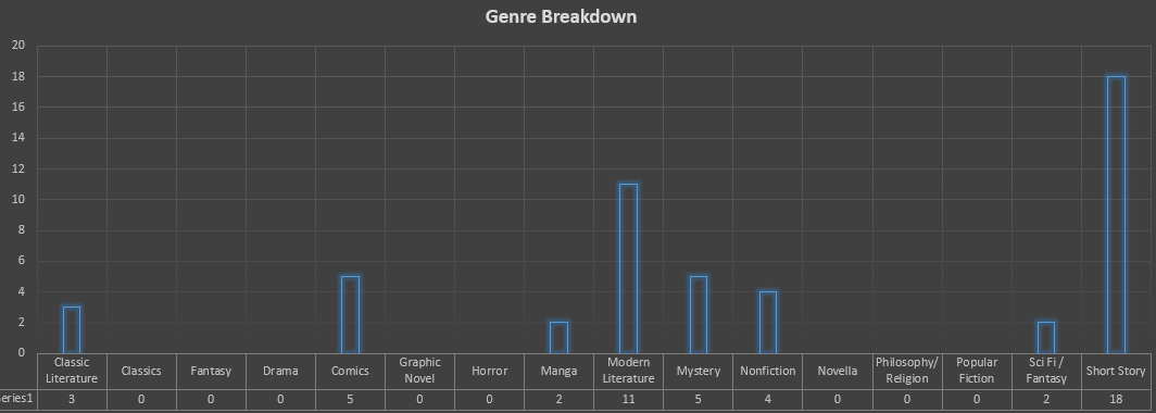 Length Goals: Total Books: 50 (stretch goal of 75) | Total Pages: 25,000 | TBR Reduction: 25 (stretch goal of 50) Substantive Goals: Read at least 51% non-American authors | Read more female/gender-fluid authors than male | Read at least 52 short stories | Read at least 10 of the New Leaf Book Club selections | Complete a re-read of the Pevear and Volokhonsky translation of War and Peace Aggregate Totals (including both Jan and Feb): 32 books - 61% of my goal (43% of stretch goal) - on target 18 short stories - 35% of my goal - on target 8,239 pages - 33% of my goal - on target 47% female/nonbinary authors / 53% male authors - off target - A number of classic short stories pulled this down in Feb. 60% US authors (down from 71%) / 40% non-US authors (up from 29%) - off target but making gains 95 of 365 chapters of War and Peace complete - on target TBR Reduction: Reduced by 13 - 52% of my goal (26% of stretch goal) - on target Geeky Charts attached. (But not too geeky - I only posted 4 of the 10 charts my spreadsheet generates )