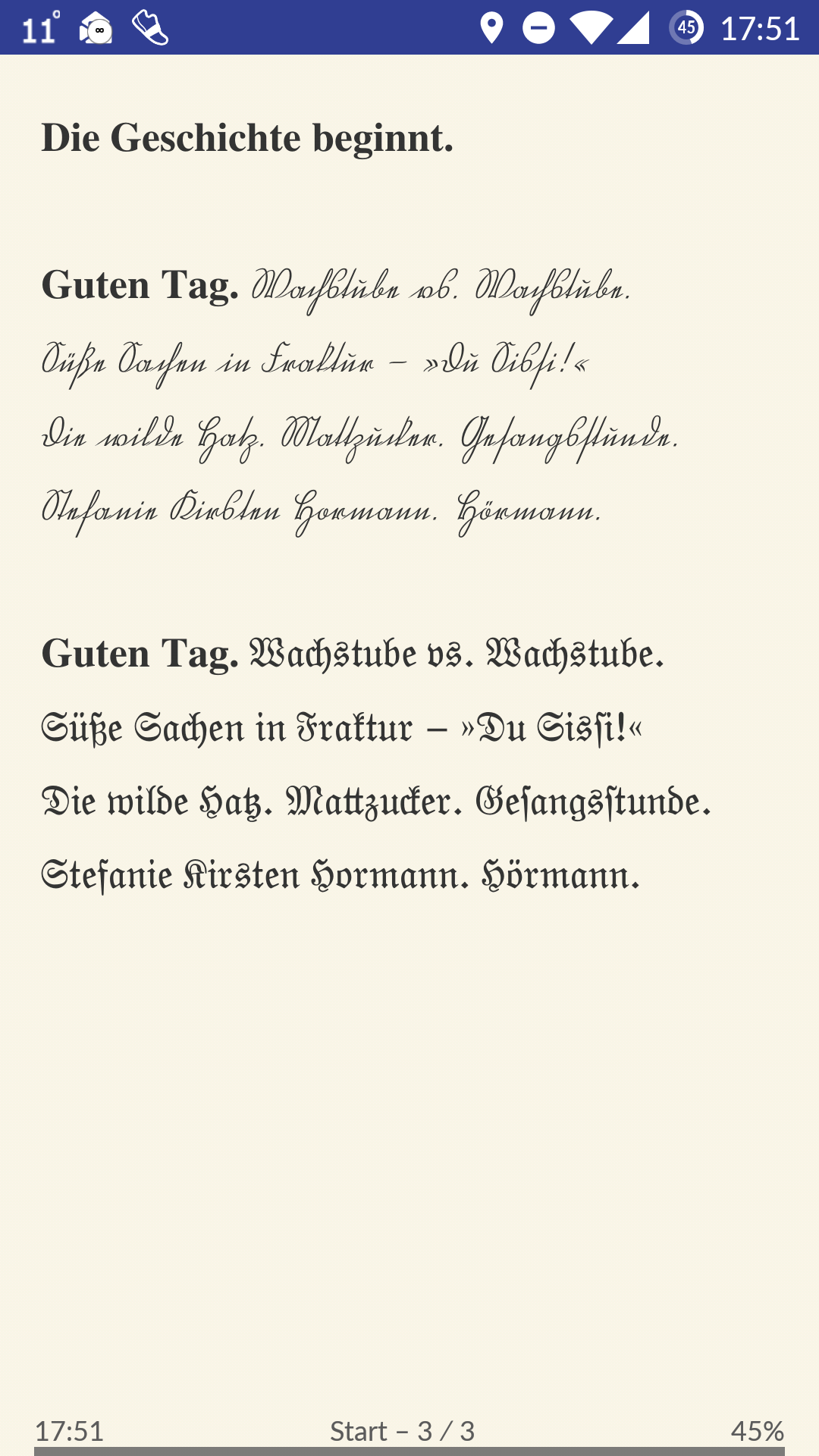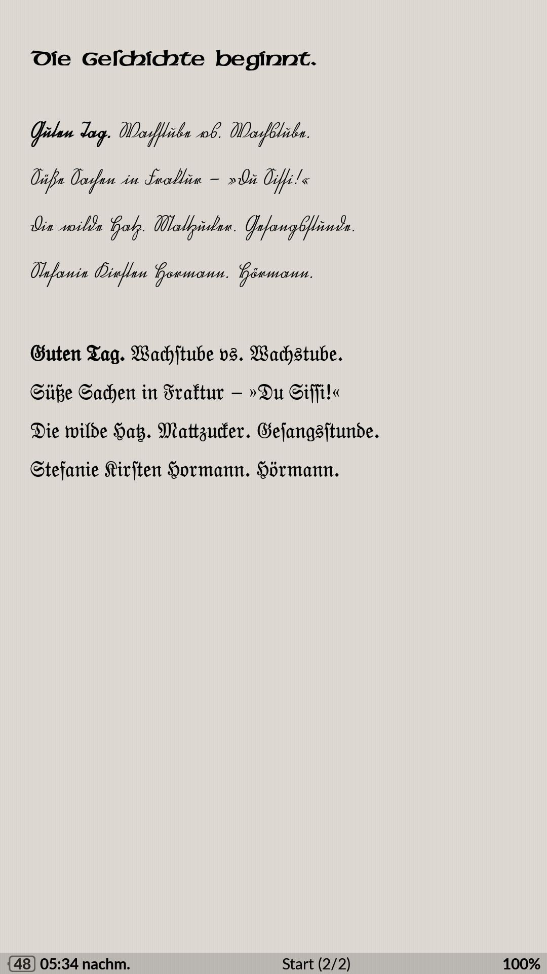That’s real good news! >Yes, just set use Document style (please see screenshot) I knew it was somewhere—thanks for the heads-up! >You can compare mupdf 1.11 vs mupdf 1.19 in the latest build (beta.librera.mobi) Thanks for investigating this matter. It seems mupdf 1.19 gets the bold right, but fails not only on the OTF font rules but also on ligatures (like "tz" in "Hatz") now. 1.11 got the ligatures right (albeit not the Fraktur typesetting rules) but failed on the bold. I’d love to see better OpenType support in Librera, since it is still my favourite reader, and I recommend it to others. So it seems, currently only MoonReader does things correctly, CoolReader and Librera don’t (yet). The reason I opted for an OpenType rule set (and a standard Antiqua base text) for setting Fraktur and Kurrent fonts was: