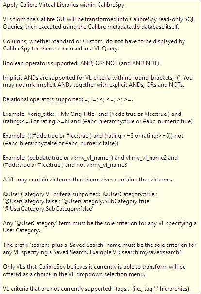 As of this version, all "real" Calibre GUI VL search criteria are supported by the CalibreSpy GUI. Not "real": 'marked:' and 'ondevice:', since they exist only in the GUI's temporary cache, and not in the actual metadata database. CalibreSpy uses the real database, and not the cache, since CalibreSpy is entirely independent of the Calibre GUI. DaltonST |