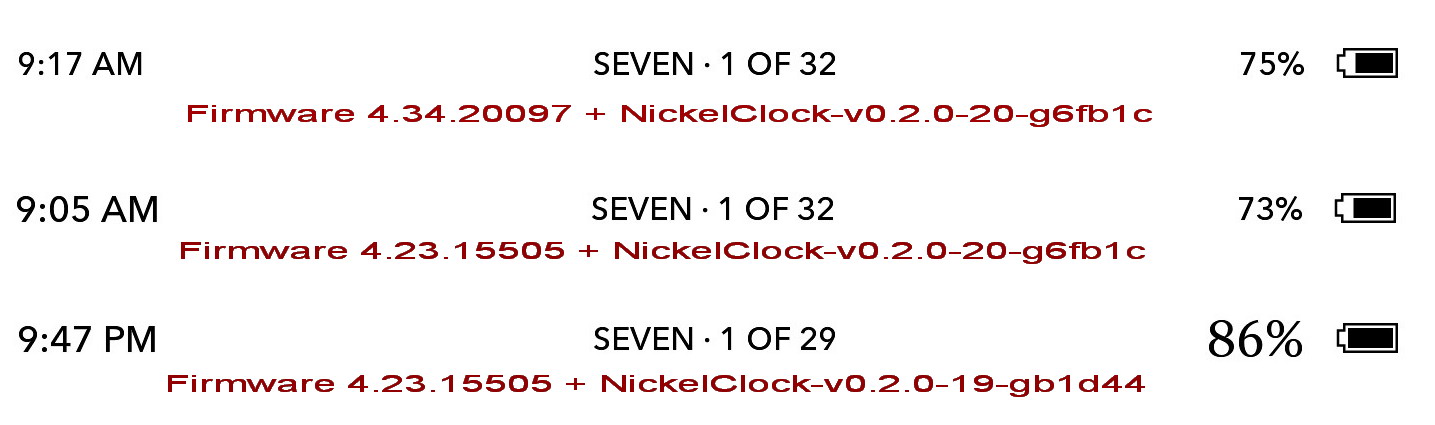 @sherman would need to confirm, but I'm going to take an educated guess that all development/testing of NickelClock was done on fw 4.32.xxxxx or 4.33.xxxxx. A lot has changed with headers/footers in the last few years. |