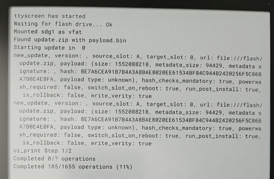 In any case, my stuff is just a wrapper. Once update_engine_sideload takes over, it's in charge. Any problems are to do with that. |