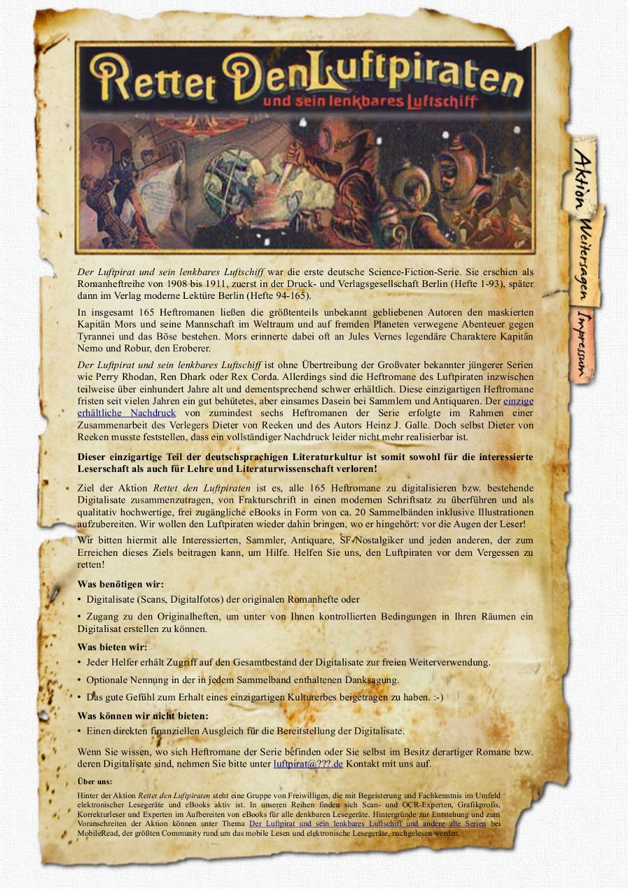 Und übergreifende Projekt- bzw. Domaintitel fallen einem da sicher zu Genüge ein. Wie wär's mit Raritaeten-Retter.de? Oder "Projekt R3", das literarische Pendant zu den ??? (3 Fragezeichen); steht für RomanRaritätenRettung für Spürnasen ![]() Trivialklassiker.de? Projekt_Pulp? Forgotten_Fiction? Save_the_Schund? Heftchen_Helden? .....