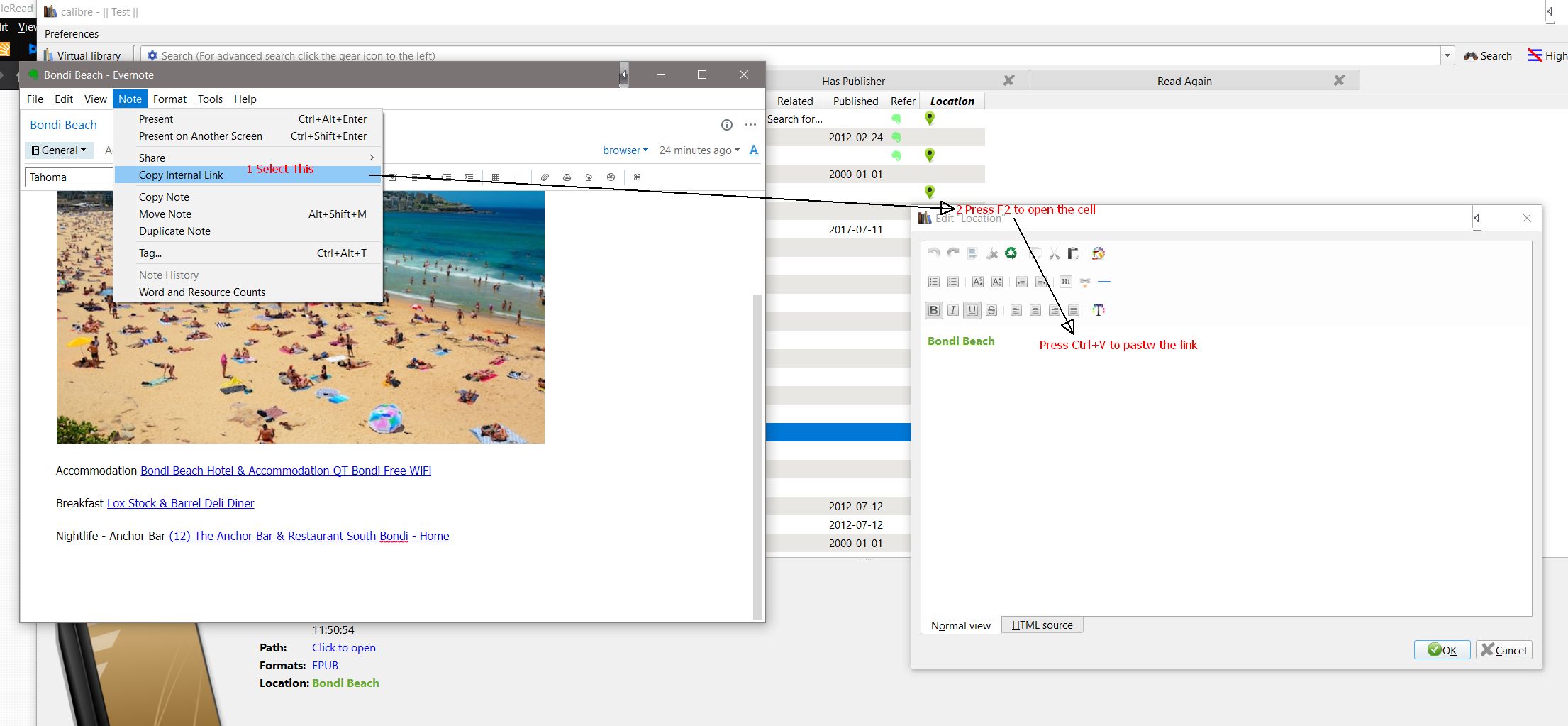 You can open a Long Text cell edit box by pressing F2 in the book list, and you can add a link to a web page by dragging its 'handle' into the edit box **. If you want to give it a label (it defaults to the url) go into the HTML tab and edit the <a ref= text. Or you can copy the url and use the link tool. Click OK (or press Alt+K) to close the edit box. An Evernote note is even easier, select Copy External link from the Note drop down. Then open the Long Text cell with F2 and press Ctrl V. In this instance the Note name will be in the <a ref text- and it'll be green so you know its an Evernote link. It helps if you have a gadget to make windows stay on top - to be honest I don't know how people can use a desktop GUI without one. Oh, and it helps if you stay away from the single Metadata Edit dialogue - I very rarely use it. I just discovered that drag-n-droppable page handles are peculiar to Firefox - Chrome and Edge don't seem to have them Ψ³ Sometimes I wonder if we're regressing to Mosaic. BR Last edited by BetterRed; 02-06-2019 at 06:05 AM. |