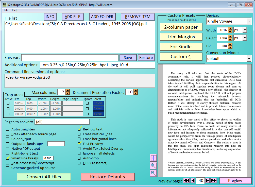 -om 0.25 P.S. You can convert a few pages at a time (e.g. A chapter or two) to keep the converted files to reasonable sizes if that helps. Last edited by willus; 12-21-2015 at 06:26 PM. |