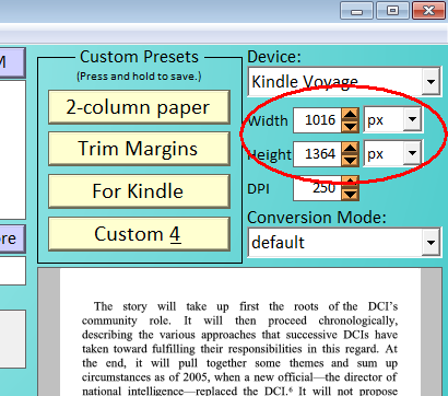 I'm having one small problem. I like using this with my Nook Glowlight Plus. Same resolution as the Kindle Voyager. But on the nook, it keeps a header and footer at the top and bottom. Which ends up overlapping some of the PDF text. What I want to do is fit to width, but leave space at the top and bottom to accommodate the header and footer. I've figured out I can leave space for the footer by adjusting the height in the device settings, but I can't figure out how to leave space for the header.