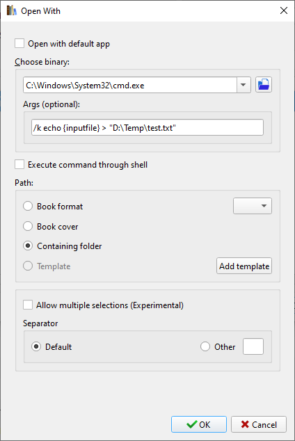 In previous version, Open With action always placed the path to file at the end of the command. With this version, you can use the placeholder {inputfile} to control where it is placed in arg box. {inputfile} passes for whatever option you choose among: format, folder, cover or template.