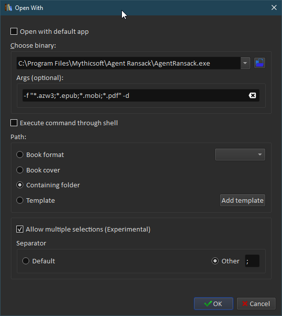 Using my 'Search with Agent Ransack' option with multiple selections fails since the latest update. (I only tested a single book before.) I get an error from Ransack about ';' and the paths of additional books being invalid command-line parameters.