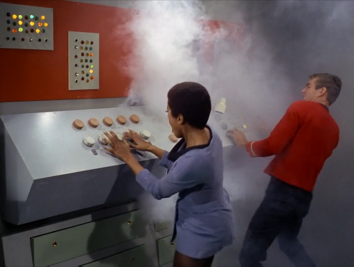 Later on, she's working on some equipment when it shorts out and all the magic smoke escapes. (Because circuit breakers apparently went out of style by the 23rd century.) Spoiler: