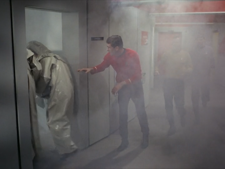 Later on, the hobo the Enterprise crew rescued from the planet attacks her in order to steal a dilithium crystal. (He also does this while she's on the intercom with Captain Kirk, resulting in his immediate capture. I'm not sure what he was expecting to happen.) Spoiler: