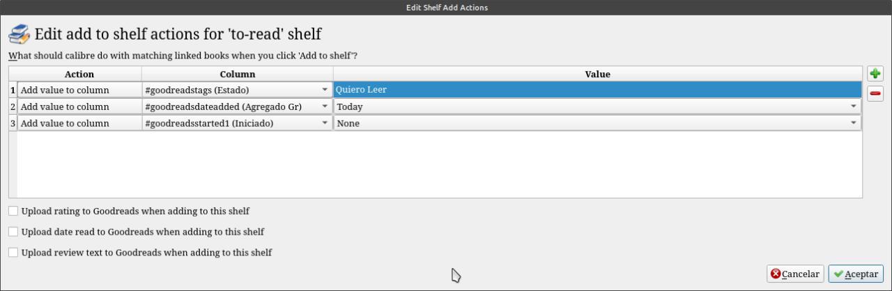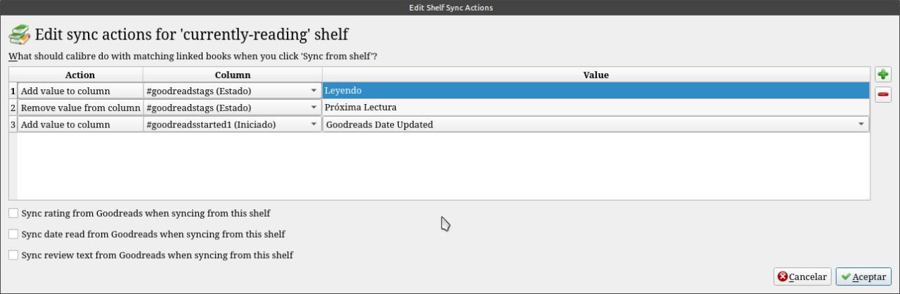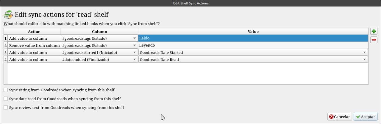 First you have to create custom columns. Once the creation of the customized columns is finished, we accept and Calibre will be restarted, so that these changes take effect, the columns will appear in the last positions, we must possess them, pressing the mouse over the column and move it to their places of choice . Now we install the Goodreads sync plugin. Once the plugin is installed, Calibre restarts and the Goodreads sync icon will appear in the toolbar. We click on the icon and touch customize complement. in that field we put the email address with which we enter Goodreads a screen opens where we have to authorize the plugin with Goodreads, just by touching the button that says Authorize our Goodreads section opens in the browser. And our Goodreads shelves are automatically added to the plugin. I leave here below what they have to put on each shelf all by clicking the settings for the shelves of To read Actions to add to the shelf: Actions to synchronize shelf: Reading (currently reading) Actions to add to the shelf: Actions to synchronize shelf: Read (read) Actions to add to the shelf: Actions to synchronize shelf: |
